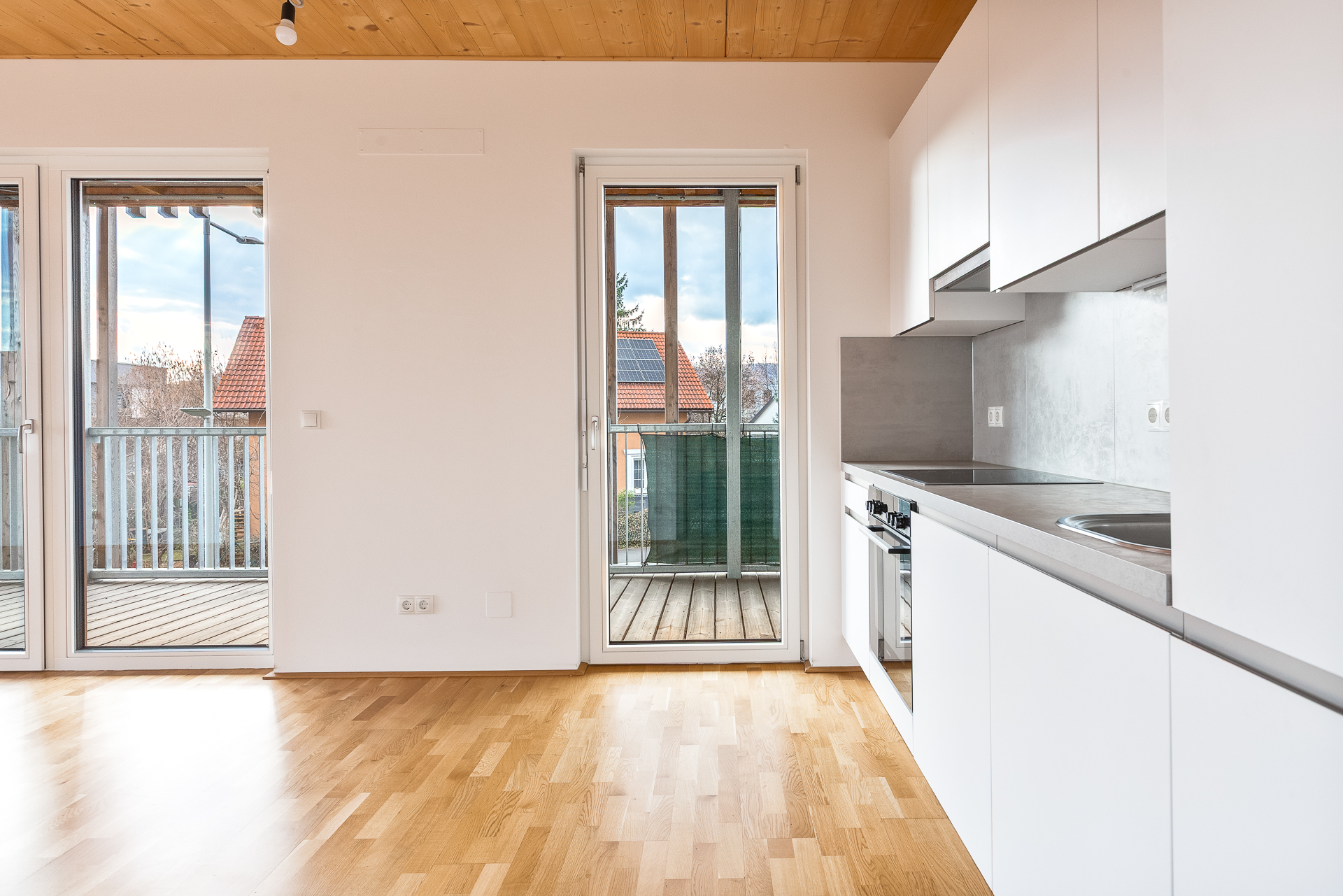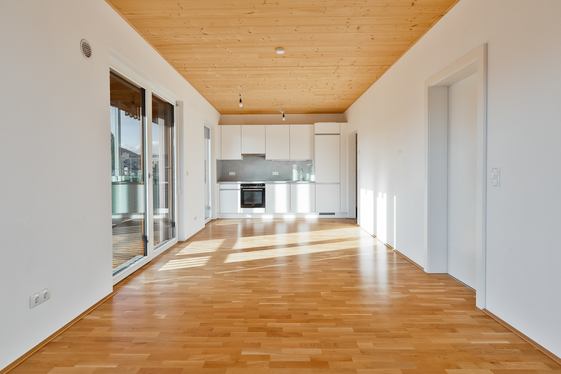 ● Wohn-Essbereich (25,58 m²): Das Herzstück der Wohnung – großzügig geschnitten und mit einer voll ausgestatteten, offenen Einbauküche im zeitlos modernen Stil. Mehrere Fensterfronten schaffen eine lichtdurchflutete Atmosphäre und ermöglichen den direkten Zugang zum Balkon.