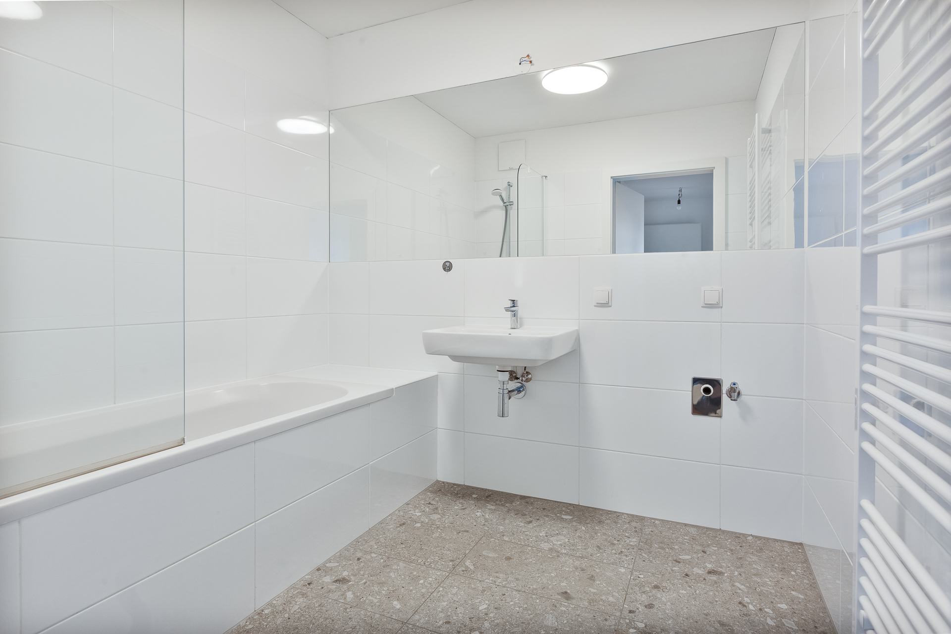 ● Badezimmer: Modern und elegant ausgestattet mit einer Badewanne samt Glaswand, einem Waschbecken und einem wandbreiten Spiegel, der den Raum zusätzlich optisch vergrößert. Ein Handtuchtrockner sowie ein Waschmaschinenanschluss befinden sich ebenfalls im Badezimmer.