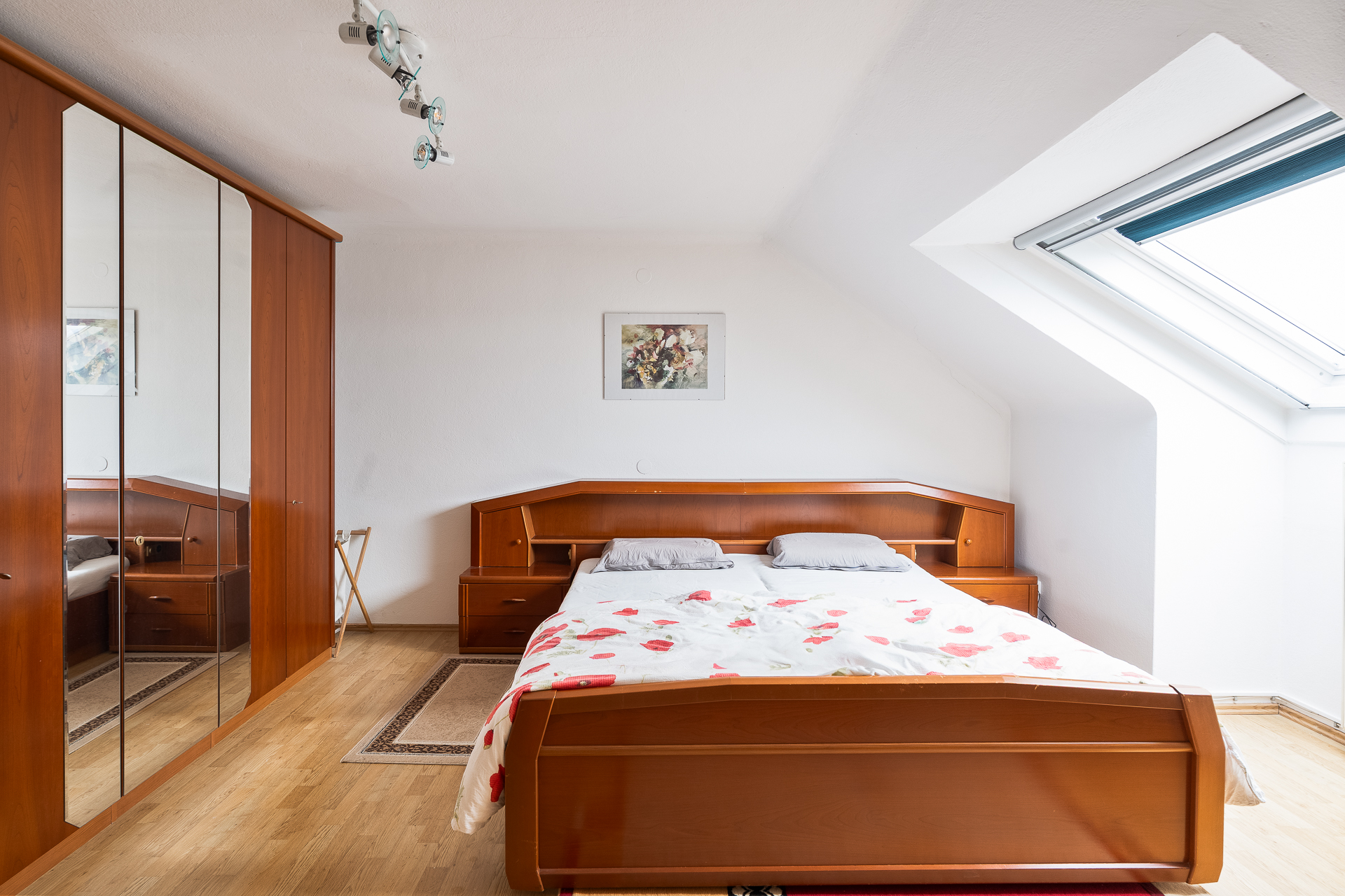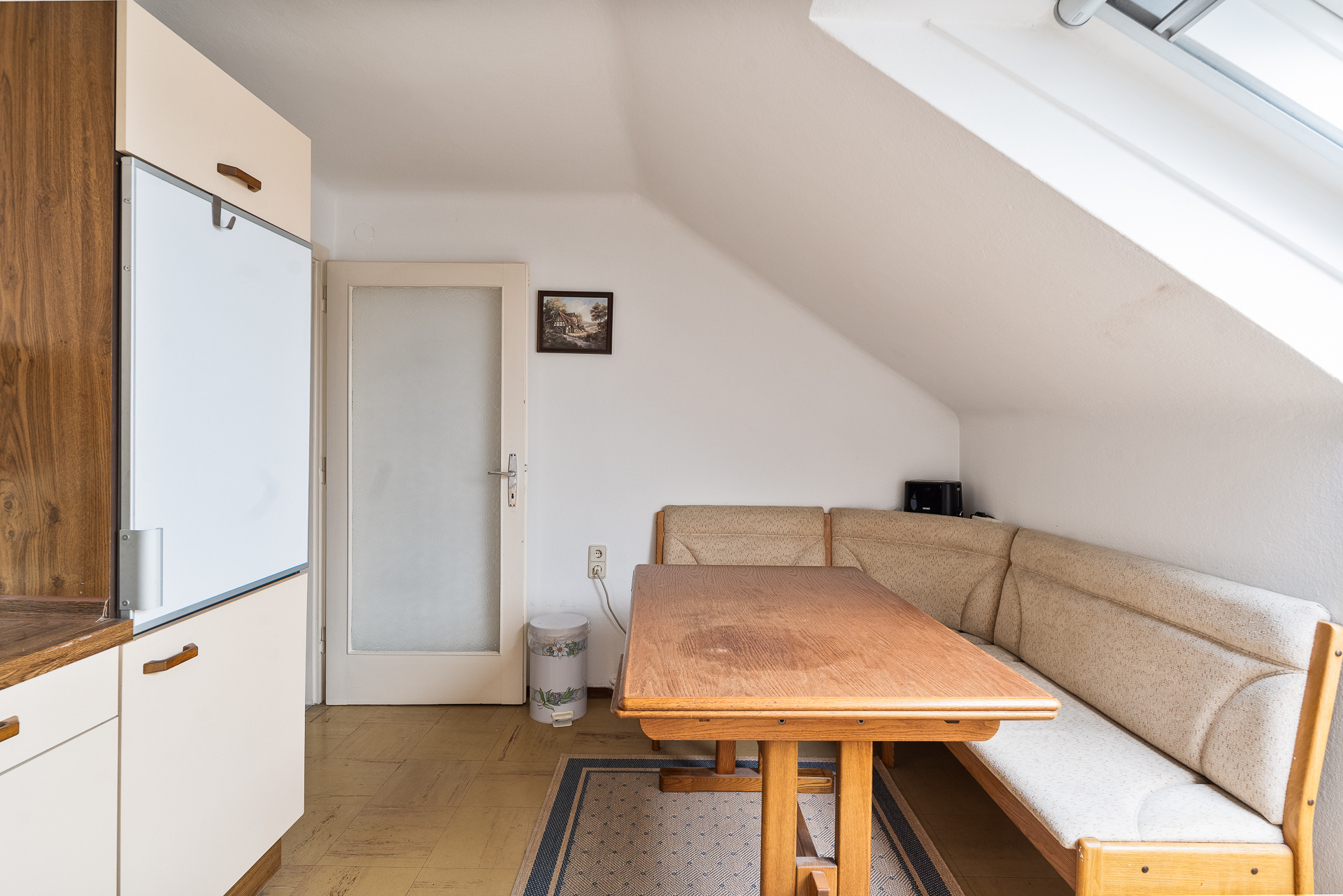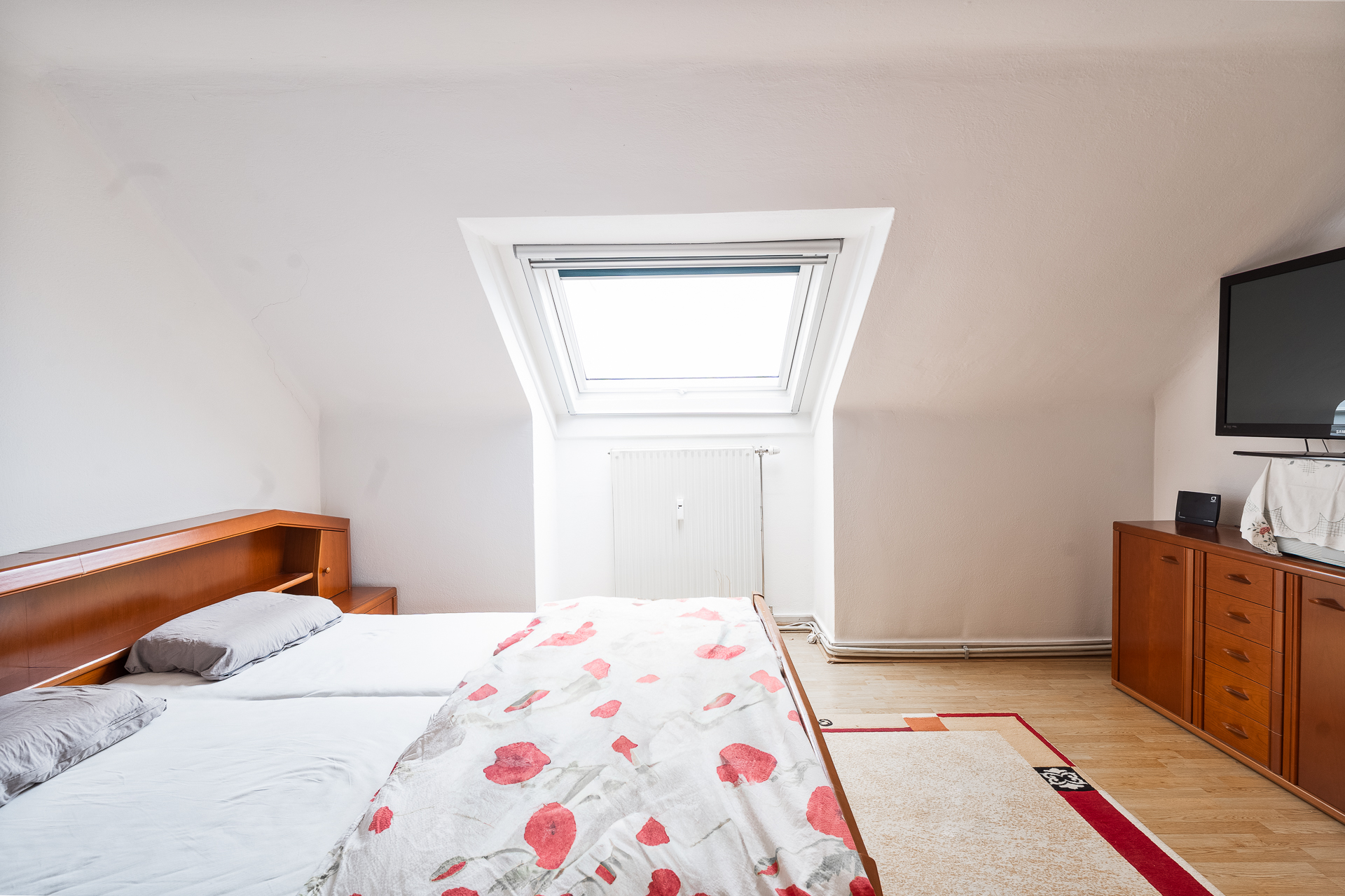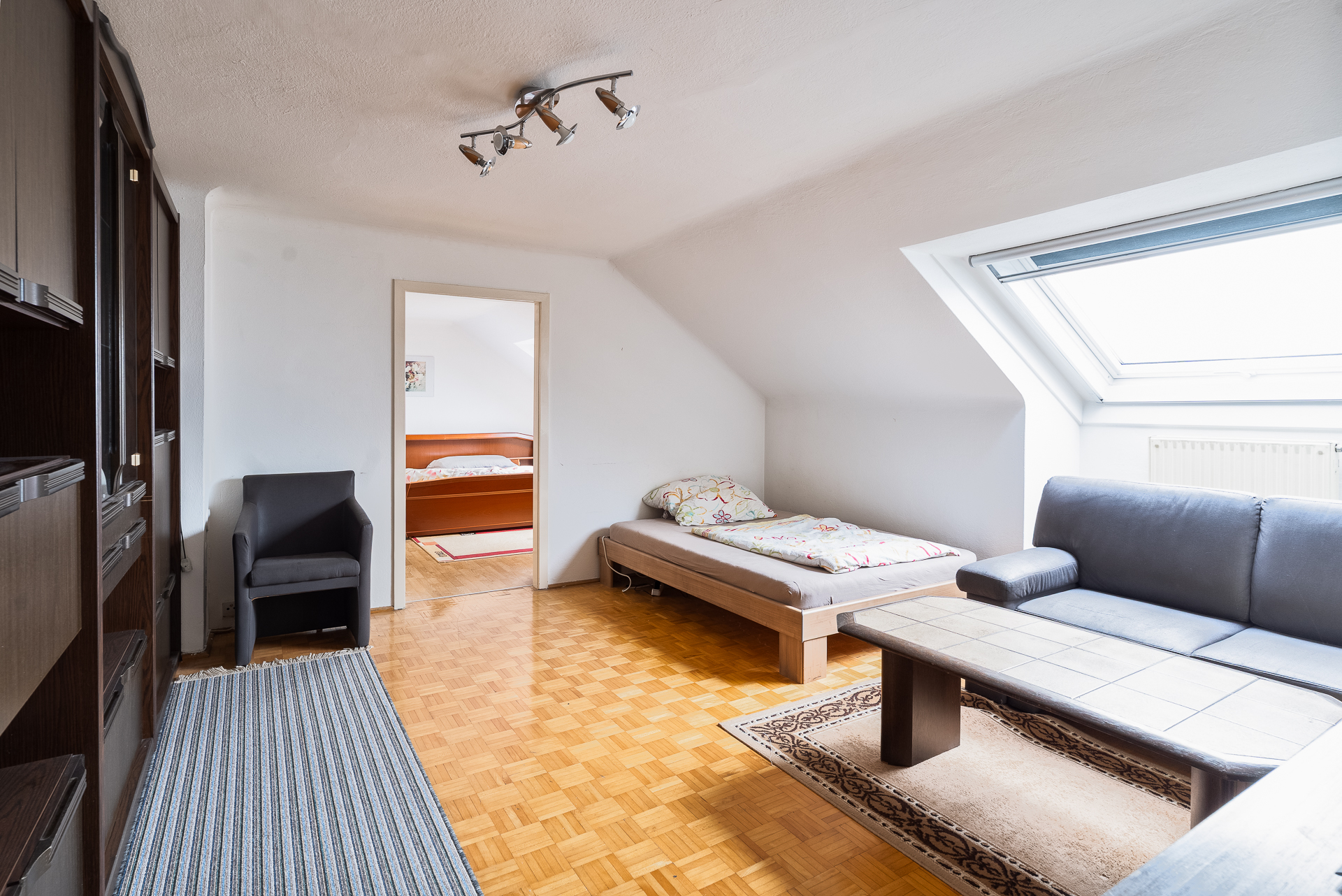 ● Wohnzimmer: Vom Vorraum geradeaus begehbar; großzügig geschnitten, hell und lichtdurchflutet. Die großzügig öffnenden Dachflächenfenster schaffen ein luftiges „Französischer-Balkon-Feeling“ und bieten zugleich einen herrlichen Ausblick. Vom Wohnzimmer aus gelangt man direkt ins Schlafzimmer.