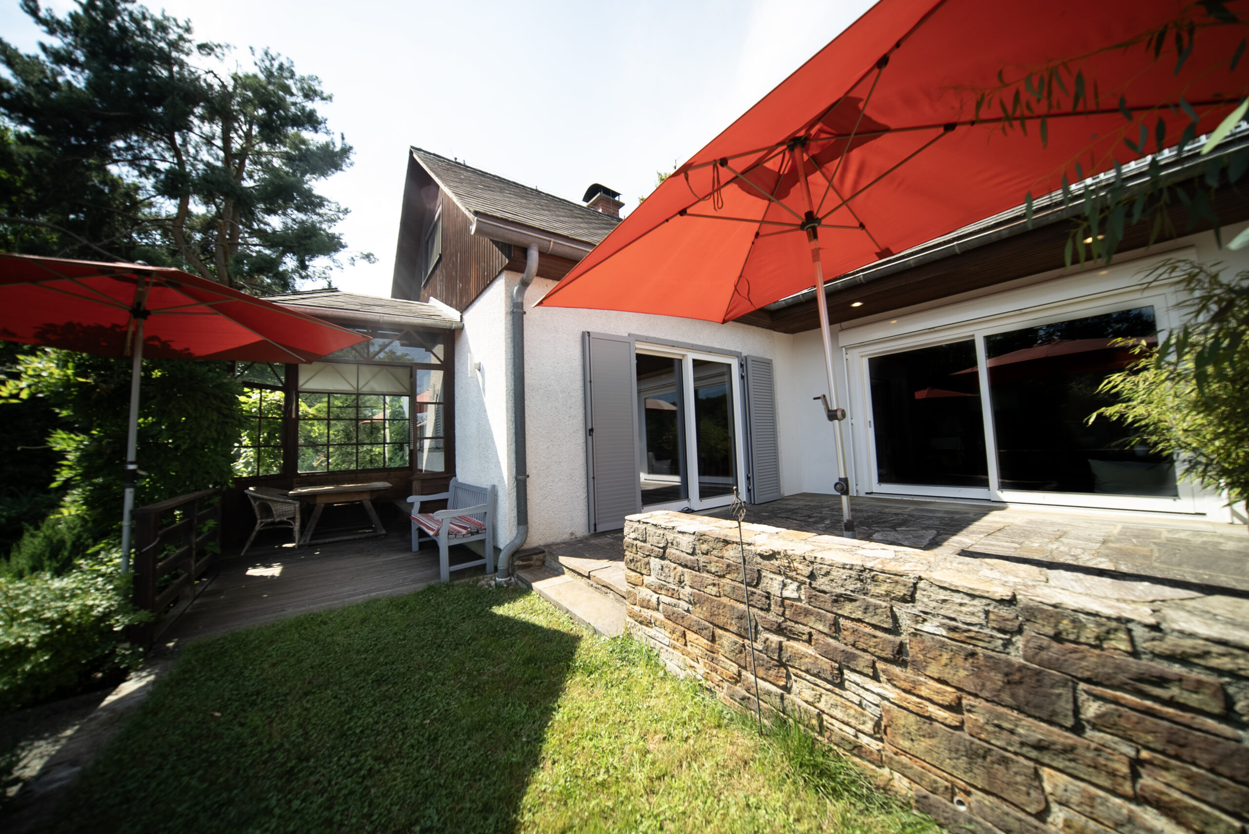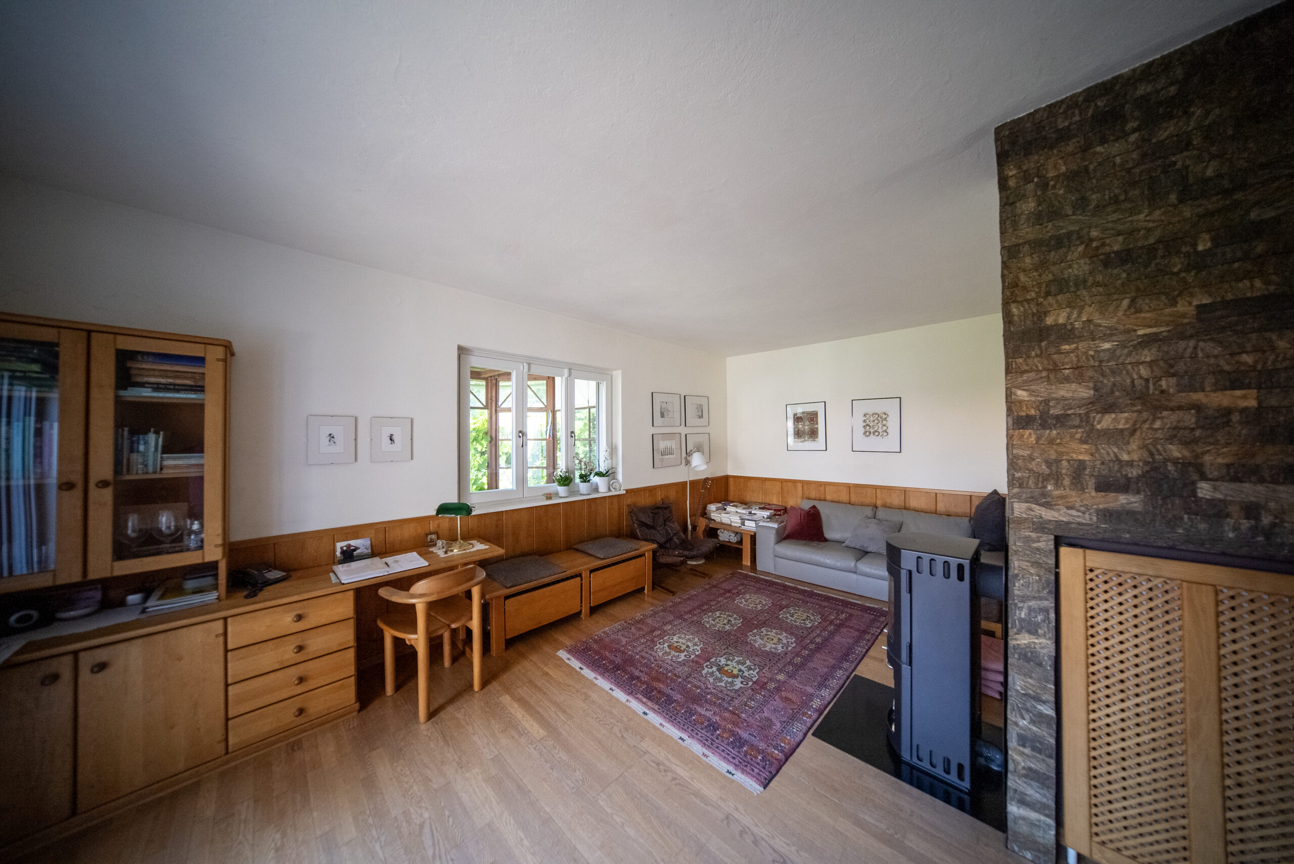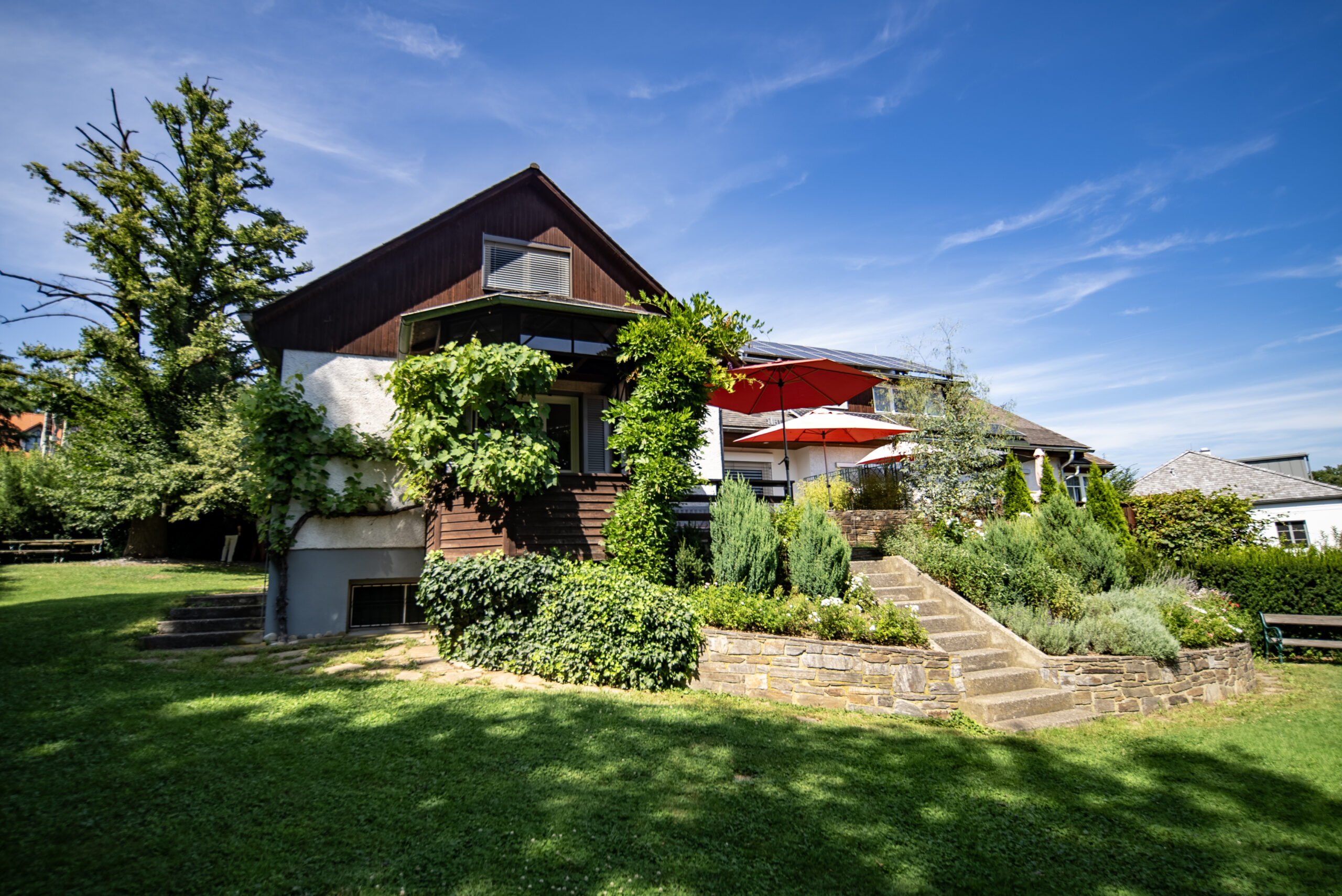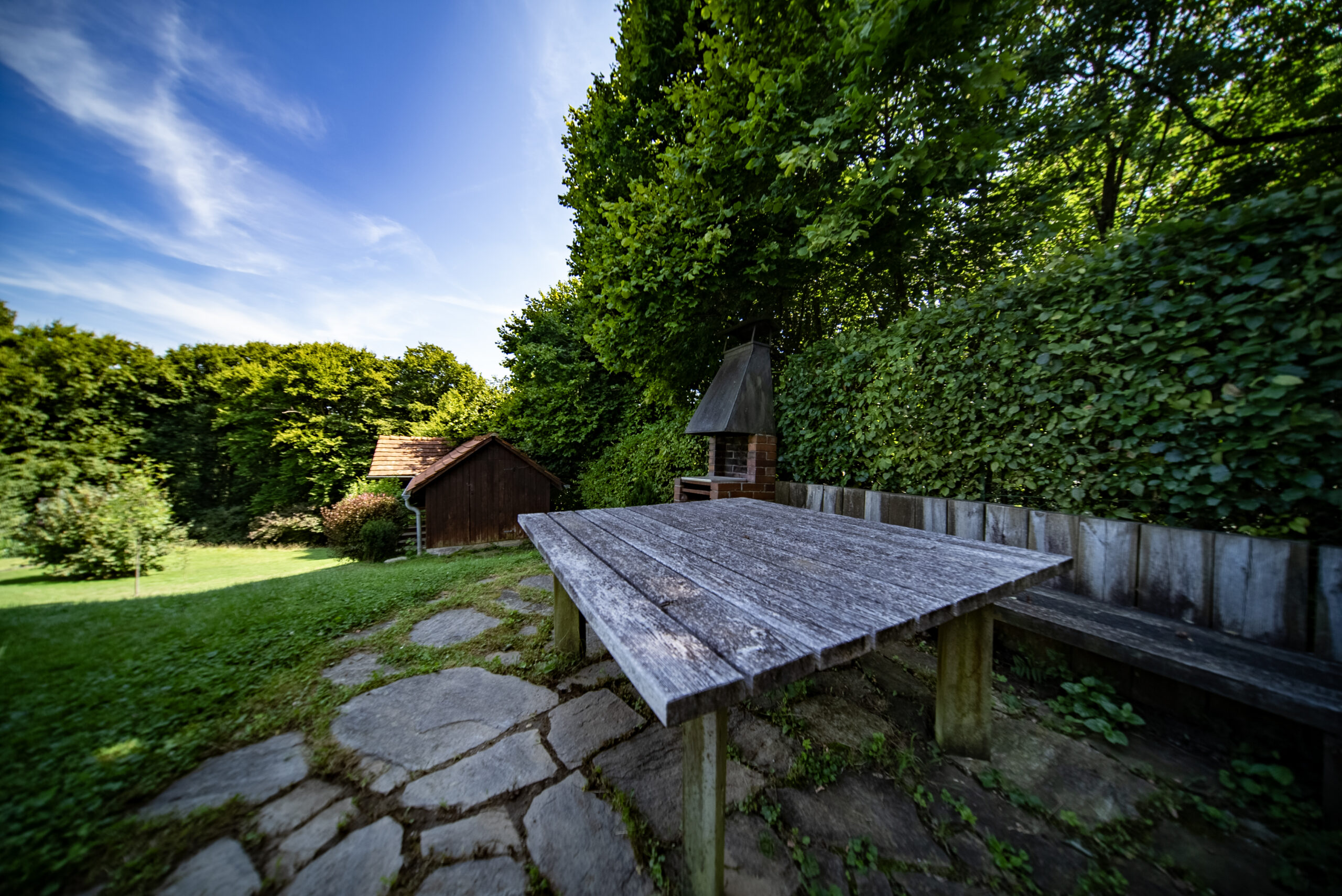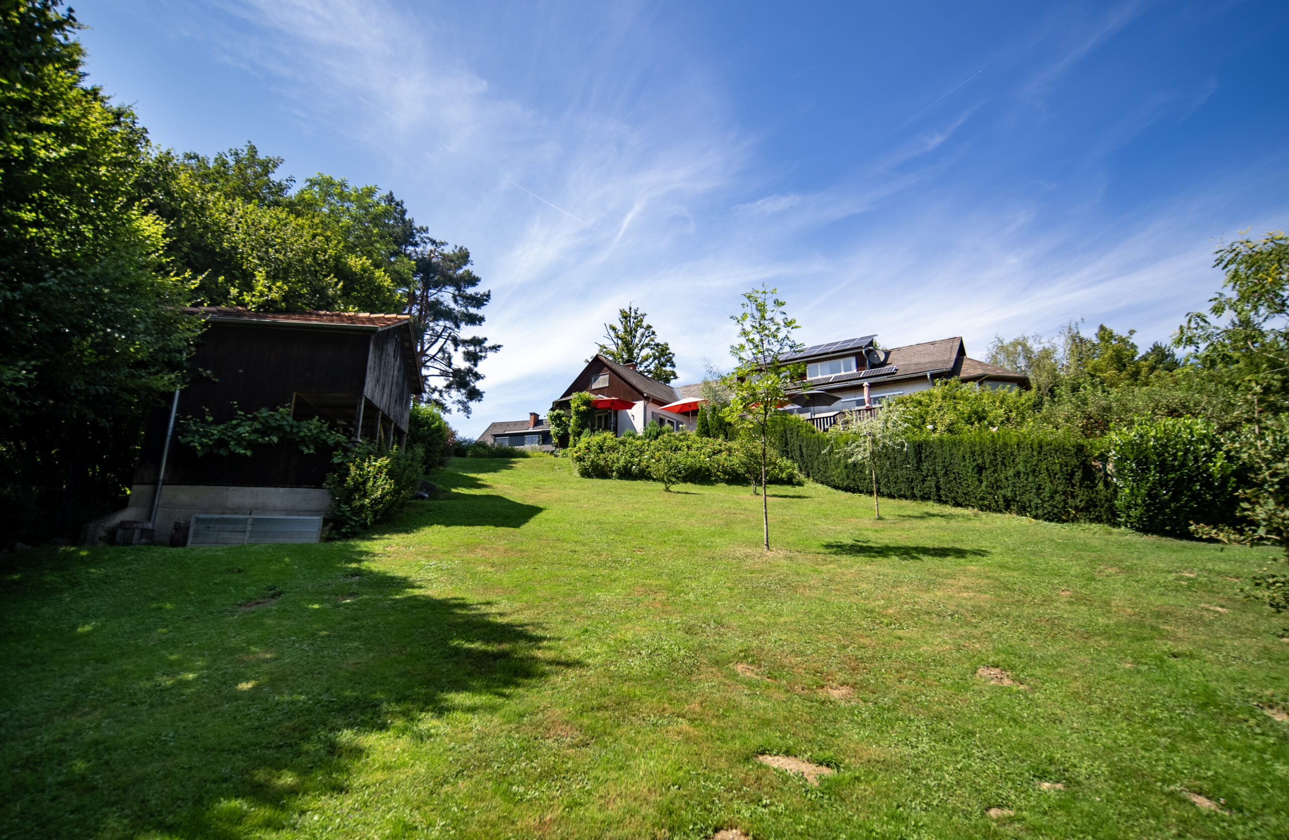 Die voll ausgestattete Einbauküche liegt in einem separaten Raum neben dem Wohn-Esszimmer. Gegenüber, ebenfalls vom Vorraum aus zugänglich, liegt ein zweites Wohnzimmer. Beide Wohnräume bieten Zugang zur teilweise überdachten Terrasse sowie zum großen, gepflegten Garten, der aufgrund seiner Größe das Highlight dieser Immobilie darstellt. Der Garten bietet Sitzgelegenheiten unter einem schönen Lindenbaum und eine geräumige Gartenhütte mit Erdkeller. Der Garten ist größtenteils Richtung Wald ausgerichtet und von Bäumen umrahmt.