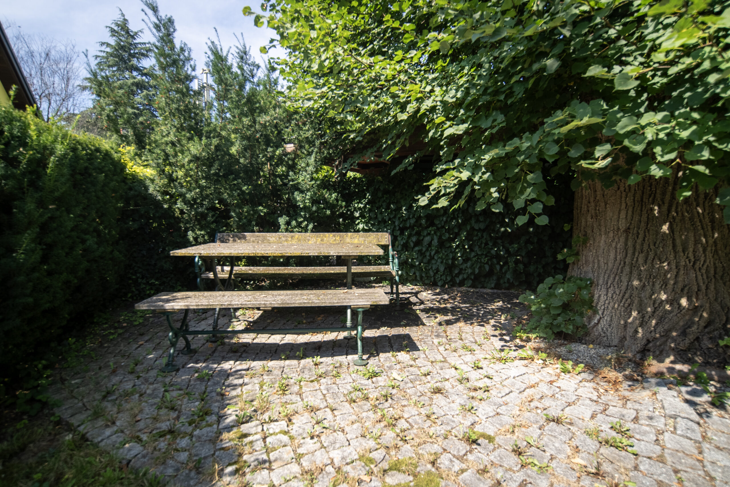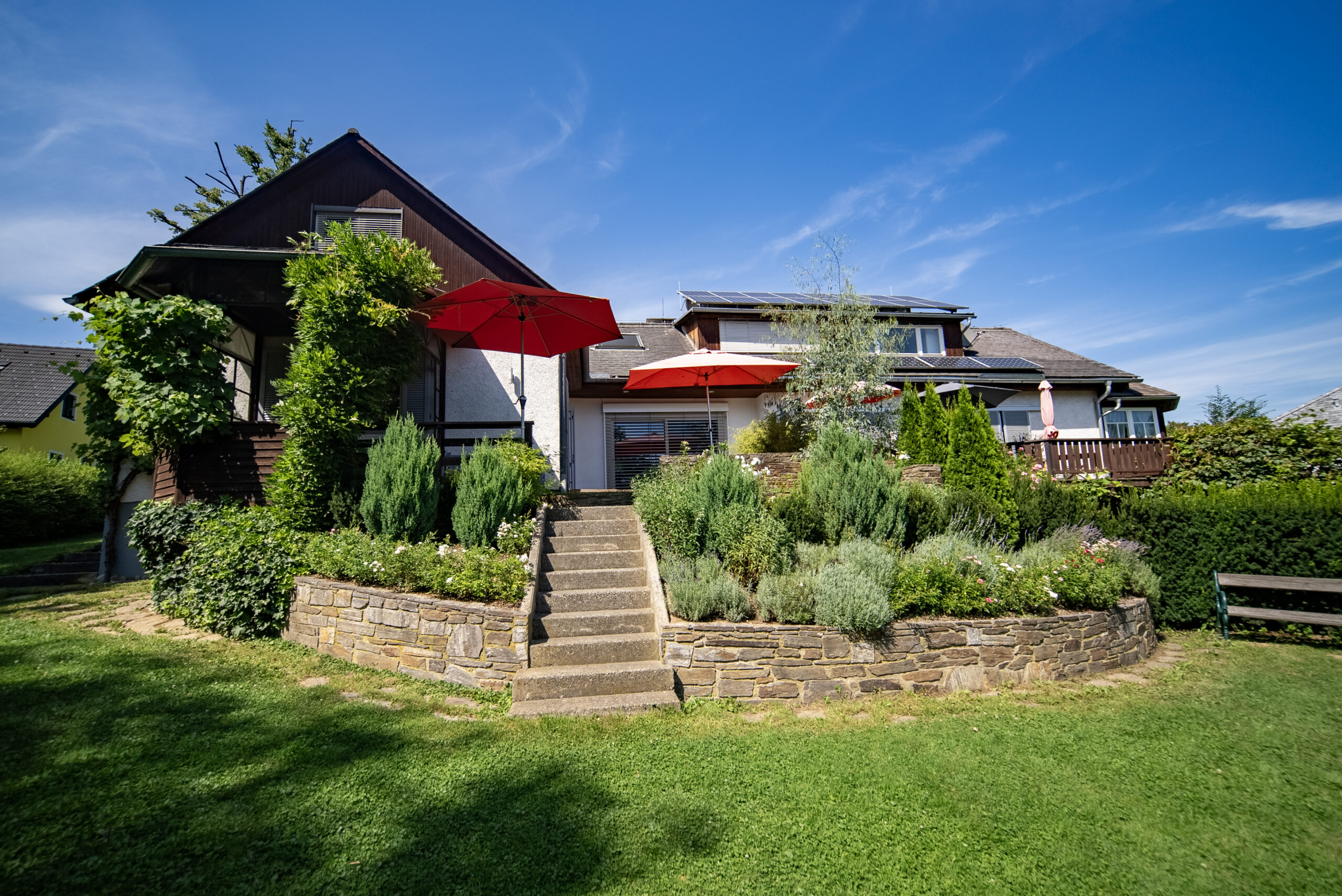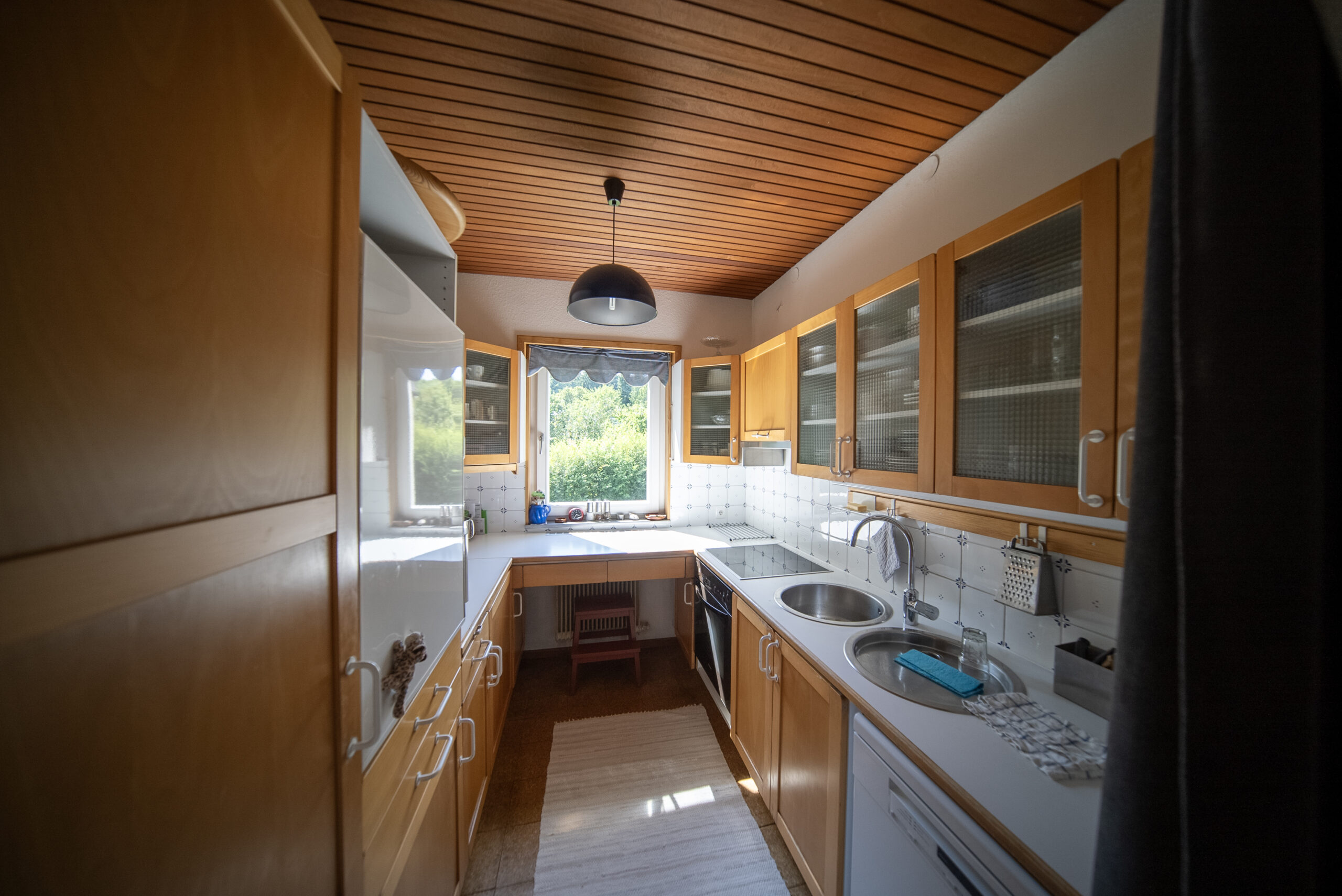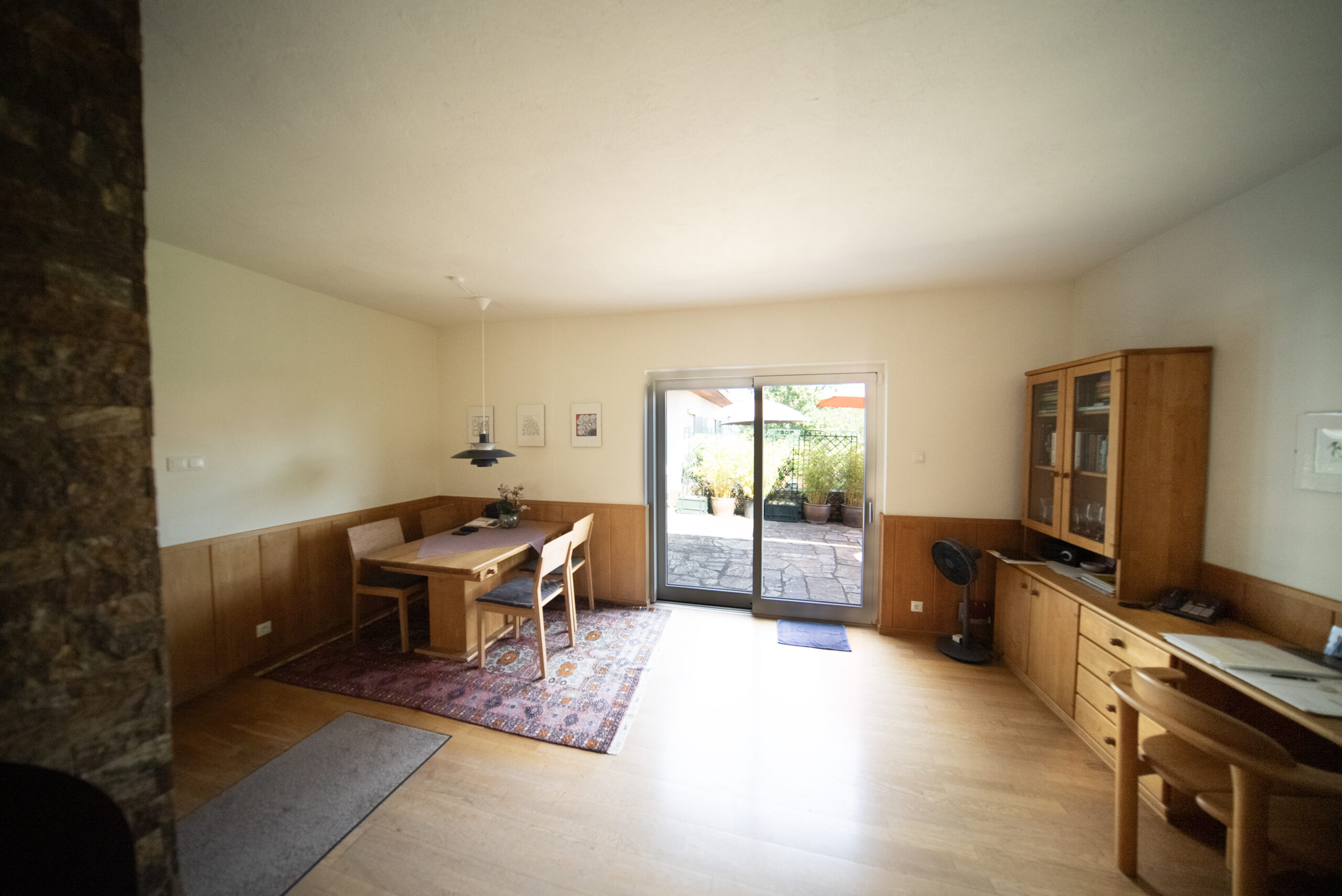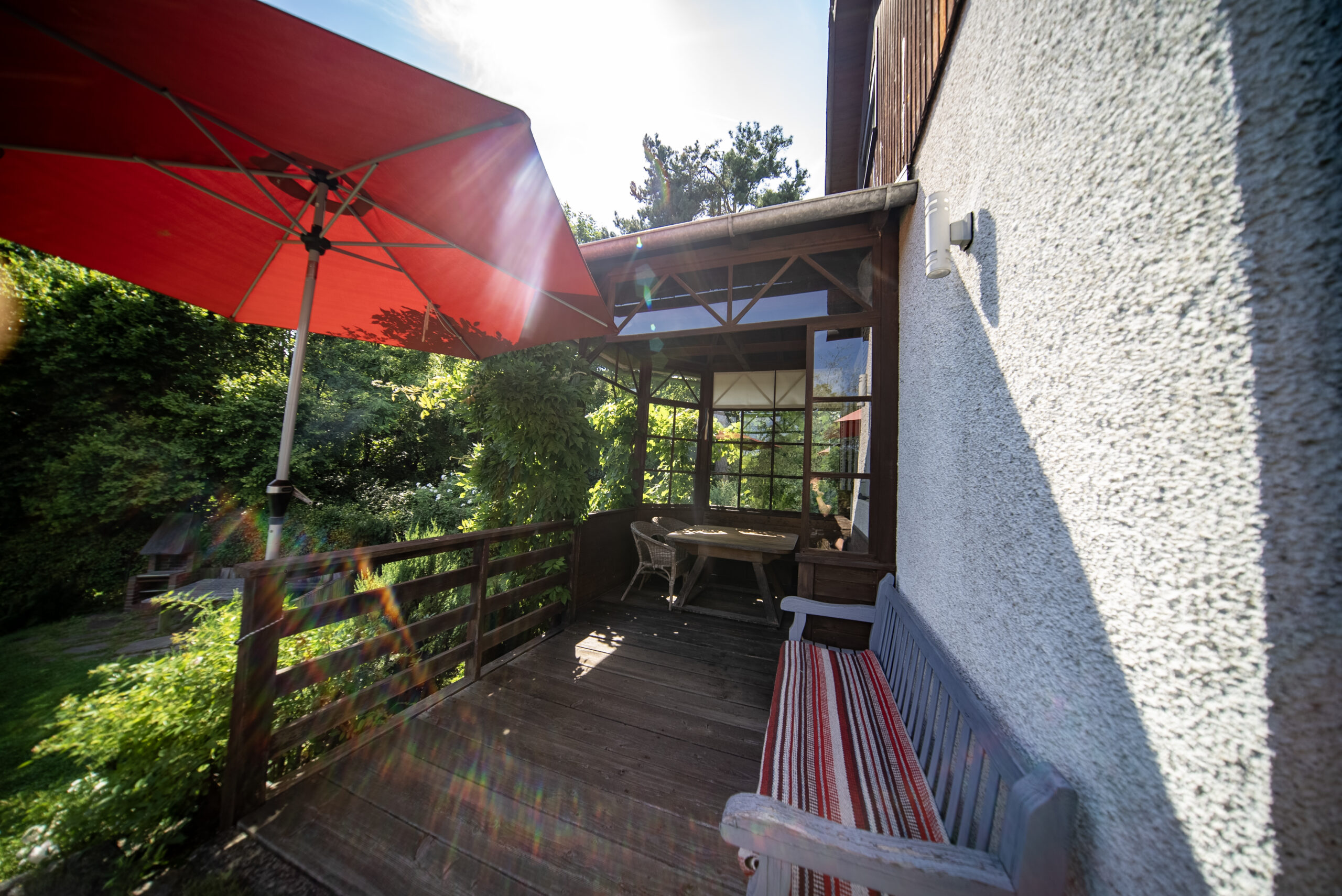 Die voll ausgestattete Einbauküche liegt in einem separaten Raum neben dem Wohn-Esszimmer. Gegenüber, ebenfalls vom Vorraum aus zugänglich, liegt ein zweites Wohnzimmer. Beide Wohnräume bieten Zugang zur teilweise überdachten Terrasse sowie zum großen, gepflegten Garten, der aufgrund seiner Größe das Highlight dieser Immobilie darstellt. Der Garten bietet Sitzgelegenheiten unter einem schönen Lindenbaum und eine geräumige Gartenhütte mit Erdkeller. Der Garten ist größtenteils Richtung Wald ausgerichtet und von Bäumen umrahmt.