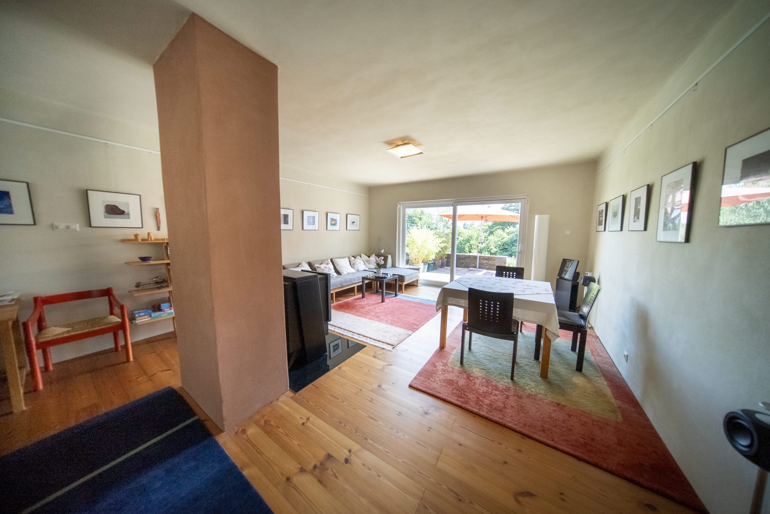 Darüber hinaus gibt es hier einen zum Treppenaufgang hin offenen Wohnraum mit Küchenanschluss